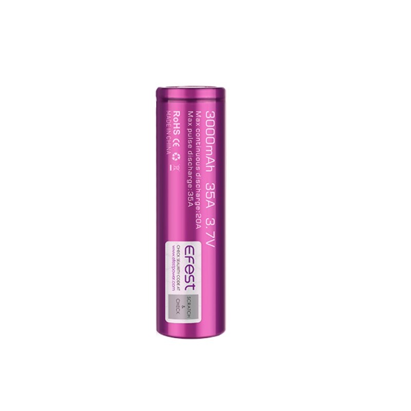 Efest 18650 3000 mAh 35A Battery Features: High Drain Lithium-Mn Battery IMR Technology Capacity: 3000 mAh Nominal Voltage: 3.7V Continuous Discharge Current: 35A General information on battery safety: Do not overcharge or over-discharge batteries. Do not leave your batteries on the charger unattended. It is a good idea to check on the charger every 15-30 minutes. Do not charge batteries over 4.25 volts as it may reduce its lifespan. Charging over 4.5 volts can also cause the battery to burst. When purchasing a charger, ensure that it has safety features built in to prevent overcharging. Recharge batteries that have dropped below 3.6V and try not to over drain them. If the battery is drained below 3.6 volts it may never recharge fully. Do not short circuit your batteries. Shorting ANY battery can potentially burn it out or cause it to explode. Keep in mind that batteries have unique amp drain limits as indicated on the product pages. Building coils with low resistance may push the battery past its amp drain limit which can cause thermal overload. If you are building your own coils, a working knowledge of Ohm's Law is essential. Do not let your batteries touch metallic items. When carrying spare batteries, make sure to keep them in an insulated case. Loose change and other metallic items can create a path between the positive and negative contacts. Lastly, always ensure your batteries and battery wraps are in good working condition. For customers at our local vape shops, we provide free re-wrap services. Batteries with dents, or that are leaking fluid are not considered safe and should not be used.