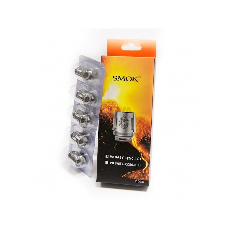 Introducing the V8 Baby Q2 atomizer heads - offering the highest resistance out of all the coils brought to you in the Baby Beast series. At 0.4 ohms, each Q2 Coil utilizes dual vertical coils carefully engineered to work wonders and bring you that legendary SMOK caliber flavor from devices that operate at a lower wattage. They have a wattage range of 40-80W with optimal performance between 55-65W. These babies are also wicked with top-shelf pure organic cotton and thoroughly tested for quality so you’re guaranteed the absolute best experience possible when you’ve got the V8 Baby Q2 in your TFV8 Baby Beast.